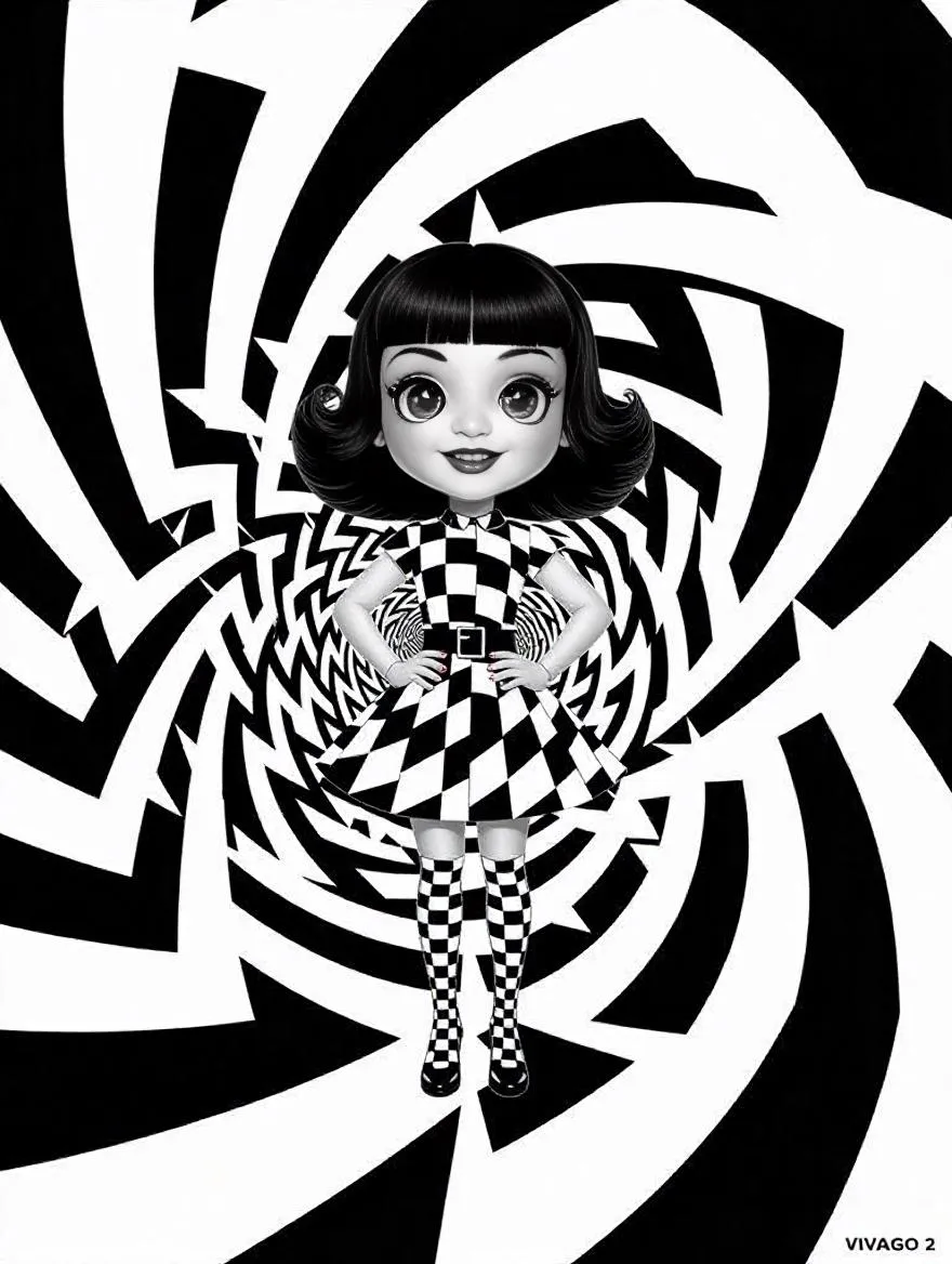 A cute girl standing in the middle of a black and white Op Art environment, with bold optical illusion patterns swirling around her. She has big sparkling eyes, a playful smile, and a retro-futuristic outfit inspired by 60s fashion. The background is a dynamic, geometric vortex of zigzag lines and concentric circles. High contrast, graphic intensity, pop-art feeling. Vivago 2.0 style.
