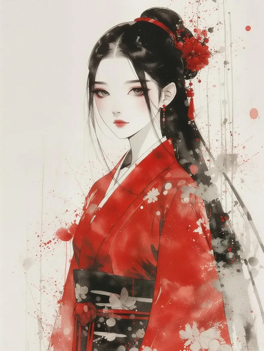 Generate a dreamlike Chinese painting portrait: woman in red, black hair, traditional costume. Features delicate ink washes, splattered effects, soft focus & pristine white background. Create epic fantasy-inspired digital art masterpiece with AI. Experience VivaGo.ai's expert tools. (Word count: 40)