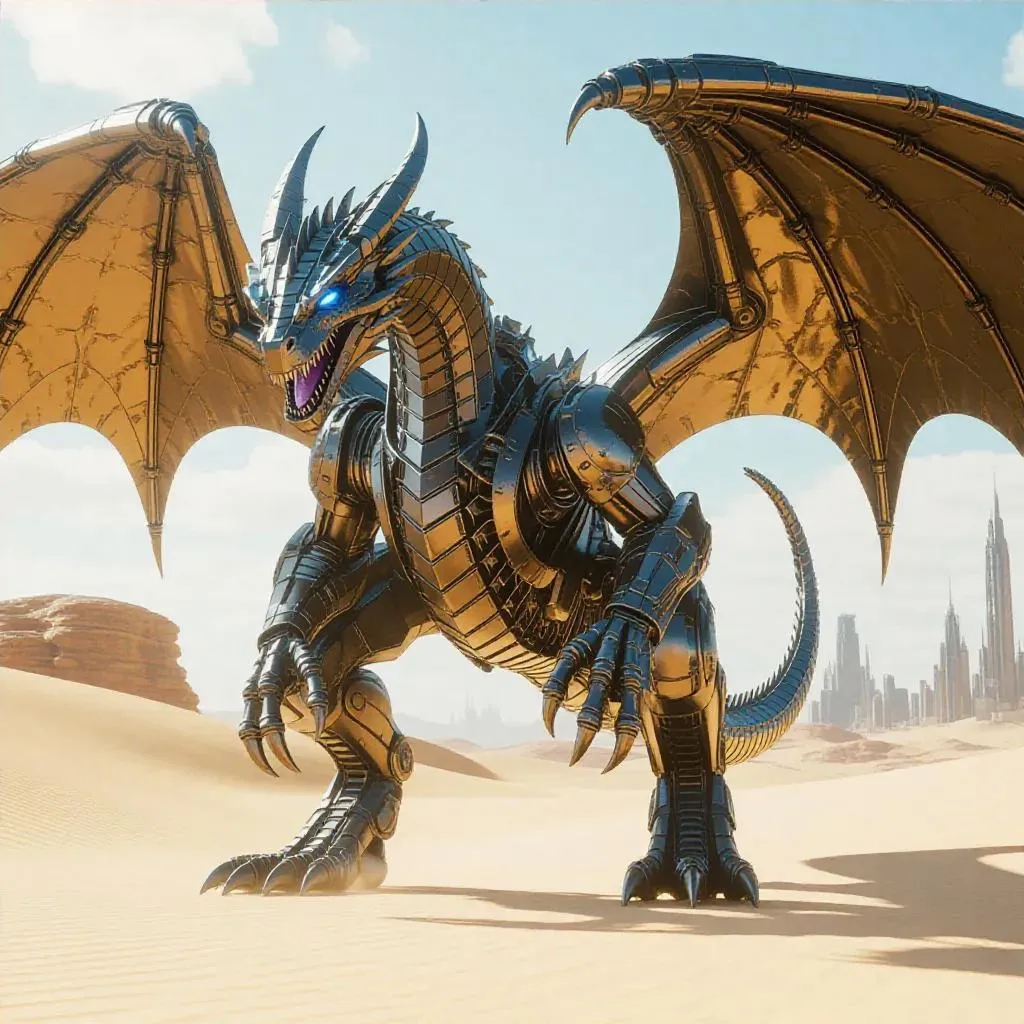 Create AI-generated art of a colossal mechanical dragon with intricate gears, glowing blue eyes, and armored wings in a desert. Features a futuristic city blending oriental architecture and advanced tech. Perfect for sci-fi creature design, fantasy landscapes, and AI art effects. Explore vivid details, dynamic lighting, and complex machinery with Vivago.ai's creative tools.