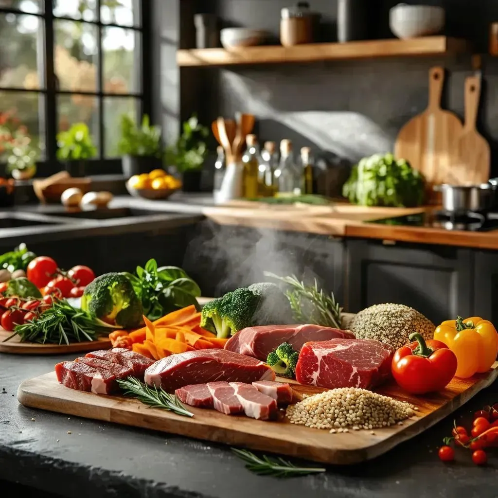 Generate a vibrant AI kitchen scene with fresh ingredients for healthy meals. Explore colorful veggies, lean proteins, and grains in a cozy, professional setting. Perfect for culinary content with bright lighting and inviting warmth—ideal for meal prep visuals, nutrition blogs, or AI-enhanced cooking inspiration.