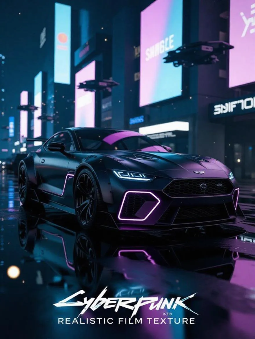 Generate a cyberpunk-style car wallpaper with AI: neon-lit high-tech metal vehicle, holographic billboards, and flying cars in a glitch-filled cityscape. Features dynamic blue-purple lighting, matte-chrome accents, energy particles, and subtle animated orbs. Realistic film texture enhances the futuristic, edgy vibe for immersive automotive art.