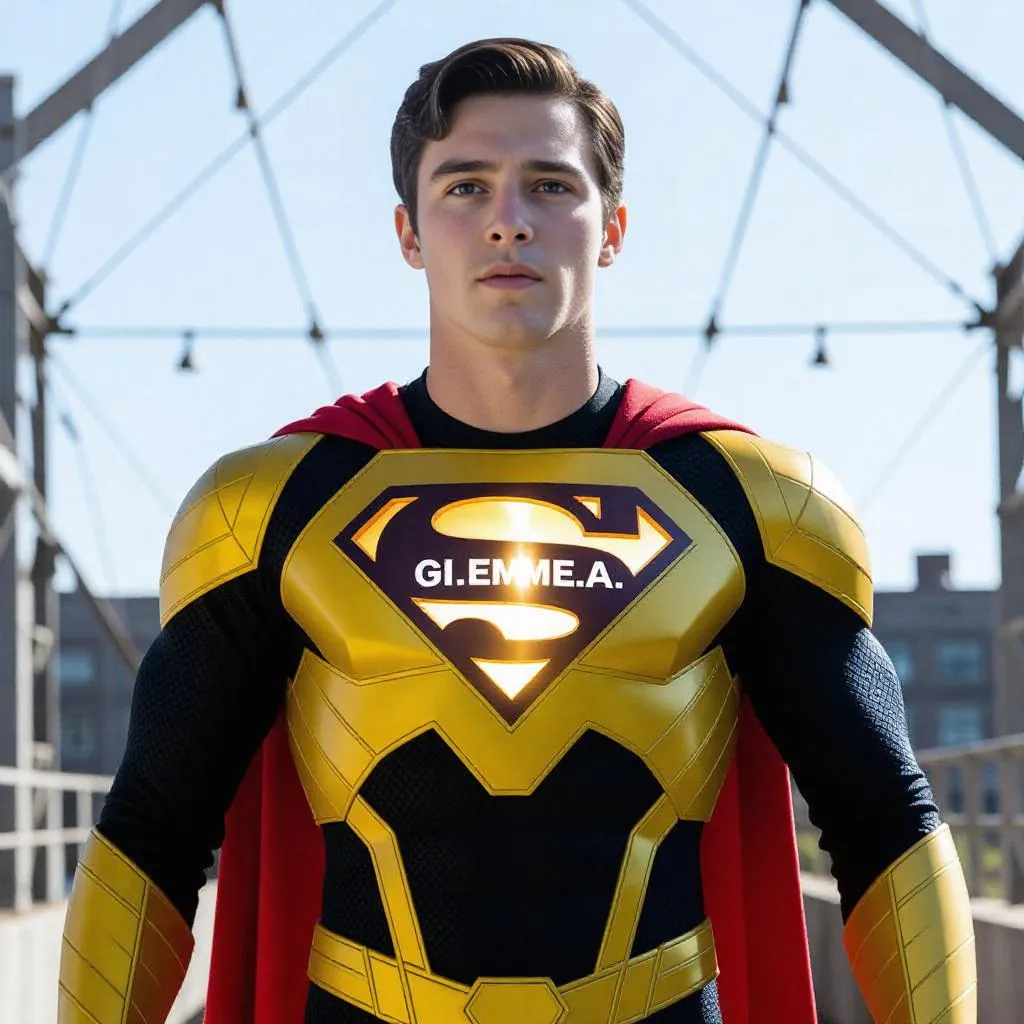 AI-generated superhero in a vibrant yellow and black suit with glowing "GI.EMME.A" emblem, bold lines, and heroic stance. Sleek, structured design contrasts with industrial backdrop. Perfect for dynamic character art, comic-inspired visuals, or AI-powered creative projects requiring striking superhero imagery and professional-grade AI effects.