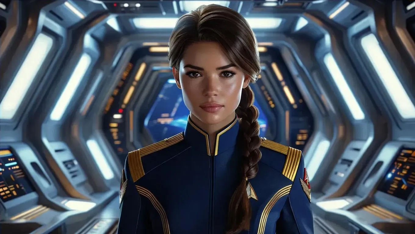Create a Star Fleet female cadet with brown hair using AI. Vivago.ai generates sci-fi characters with realistic details, futuristic uniforms, and Star Trek-inspired visuals. Transform prompts into professional-grade AI art for immersive storytelling or fan content effortlessly.