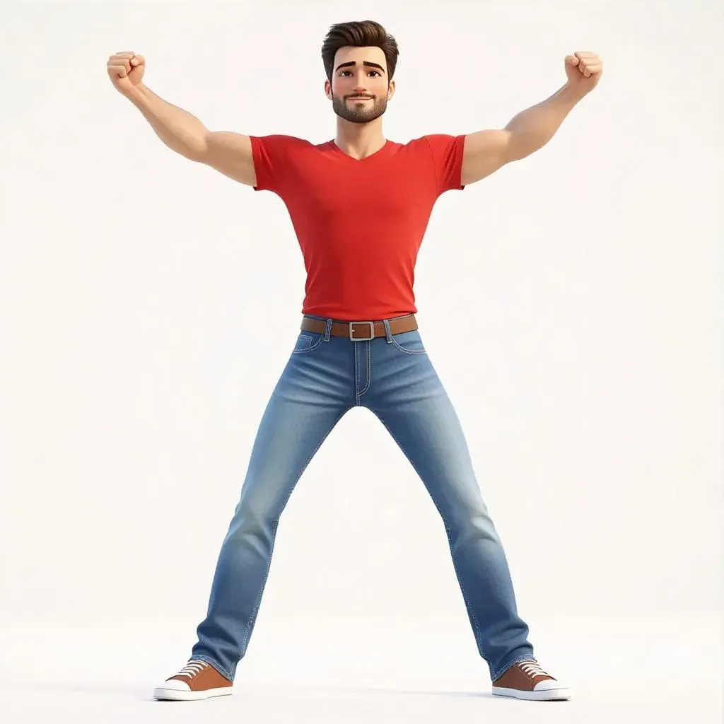 Transform Sergey Lazarev into a Pixar-style character with a red t-shirt, blue jeans, and short hair against a white backdrop. Vivago.ai's AI image generator crafts vibrant, professional animations from text prompts. Experience seamless text-to-image AI for celebrity art, hoodie details, and cartoon effects.