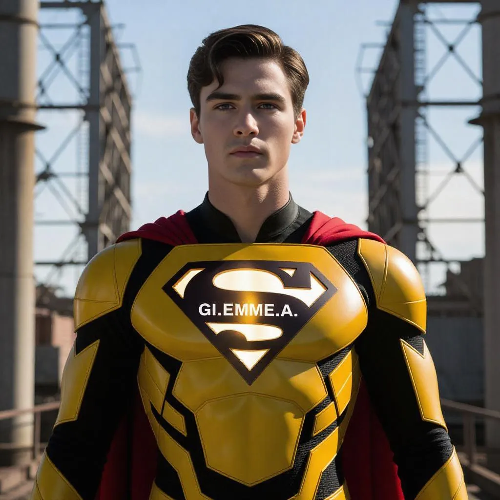 AI-generated superhero in a vibrant yellow and black suit with glowing "GI.EMME.A" emblem, bold lines, and heroic stance. Sleek, structured design contrasts with industrial backdrop. Perfect for dynamic character art, comic-inspired visuals, or AI-powered creative projects requiring striking superhero imagery and professional-grade AI effects.