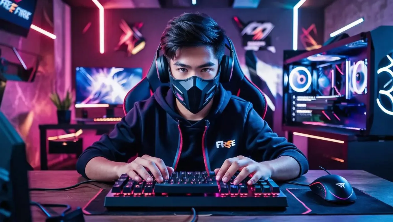 Create AI-generated visuals of a stylish gaming boy with a mask playing Free Fire on a Gaming PC. Use Vivago.ai's photo generator to transform text prompts into high-quality, professional-grade gaming content and stunning effects.