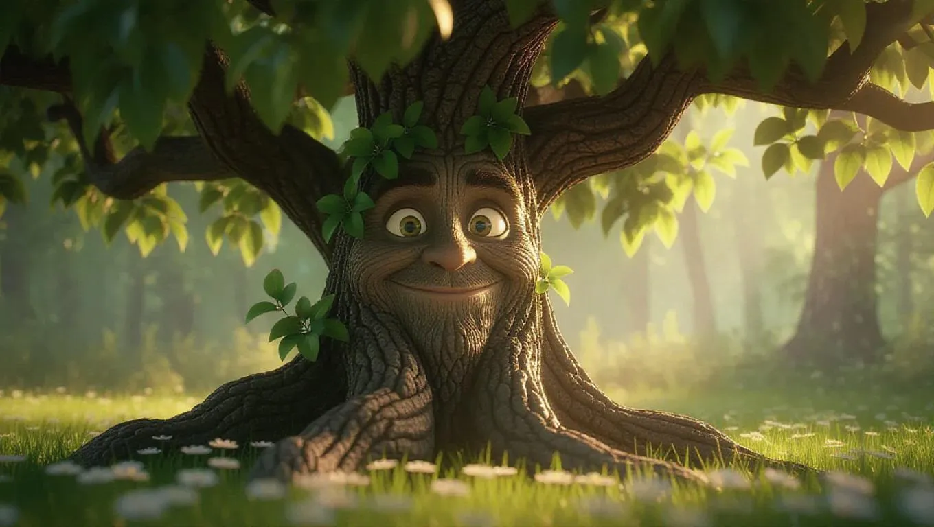 3D cartoon front view of a big magical talking tree with glowing green leaves, kind human-like face on the trunk, gentle smile, sunlight filtering through branches, surrounded by grass and flowers, cinematic forest background, detailed 3D Pixar style