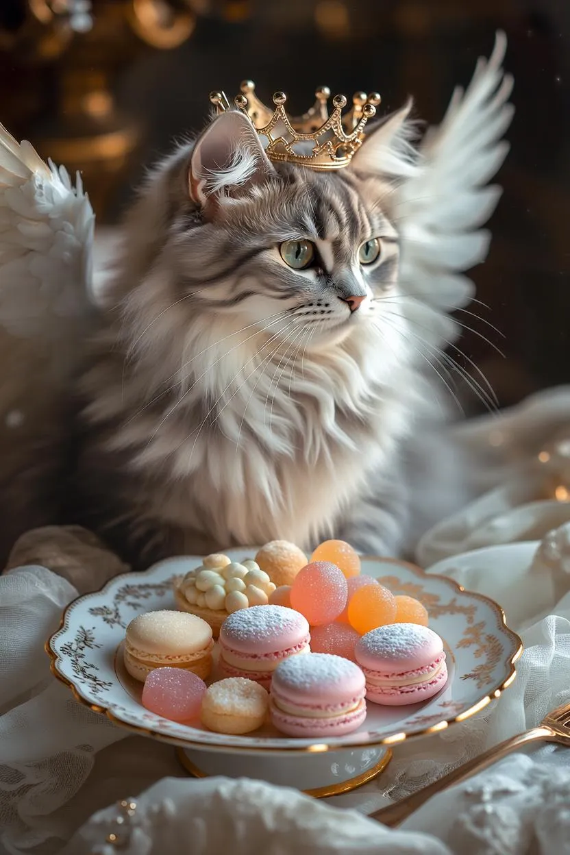 Create surreal AI-generated art with vivago.ai: a winged, crowned cat beside pastel sweets on vintage porcelain, blending whimsy and elegance. Experience moody lighting, blurred backgrounds, and intricate textures for dreamlike, painterly visuals. Elevate creative projects with professional-grade AI effects, meticulous detail, and refined visual poetry in every surreal scene.