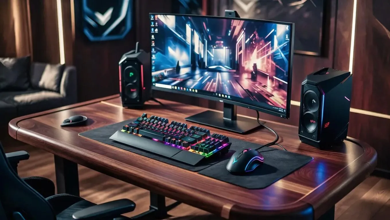 Create a photorealistic gaming desk setup with sleek keyboard, ergonomic mouse, and high-resolution monitor using AI image generation. Achieve lifelike textures, dynamic lighting, and professional gaming station visuals through vivago.ai's advanced creative tools for immersive, detail-rich designs.