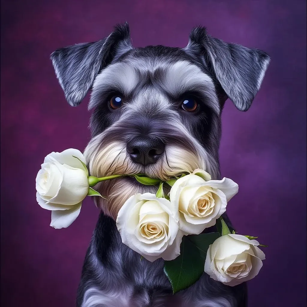Generate lifelike AI images of dwarf Schnauzers holding white roses against vivid purplish backgrounds. Capture playful expressions with soft lighting, enhancing fur textures and floral details. Create unique pet portraits effortlessly using Vivago.ai's AI art generator for professional-grade animal photography and creative visual storytelling.