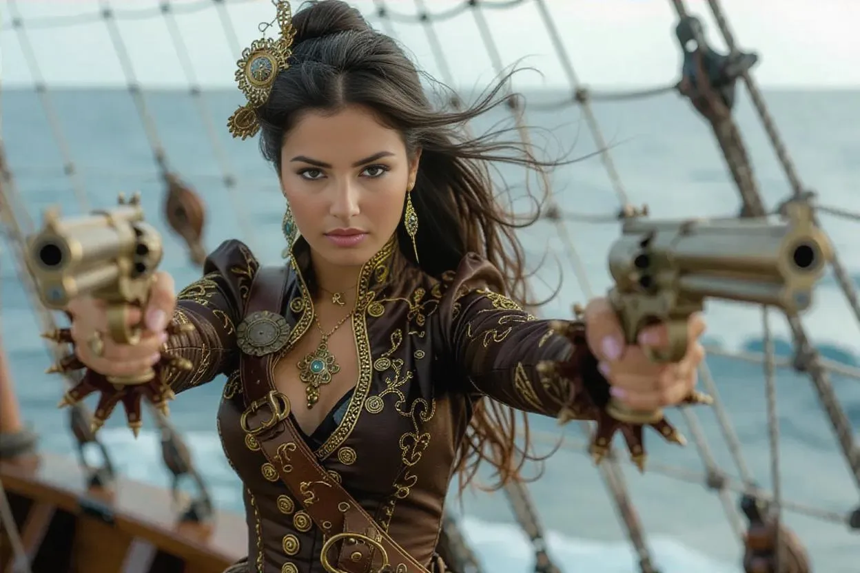 Create AI-generated steampunk art of a Mexican woman with golden guns, intricate brown-gold attire, and pirate ship backdrop. Transform text to vivid visuals using Vivago.ai's AI image tools for hyper-realistic, detailed effects. Elevate creativity with professional AI-powered steampunk style.
