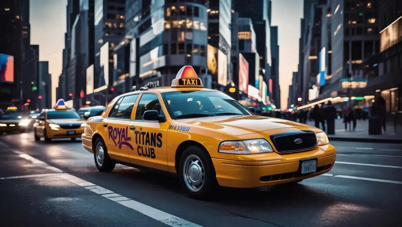 Capture dynamic urban energy with a wide-angle shot of a vibrant yellow taxi featuring bold "Royal Titans Club" graffiti-style lettering. AI-powered tracking camera movement highlights the taxi's bright contrast against a bustling city backdrop, ideal for striking promotional visuals or social media content.