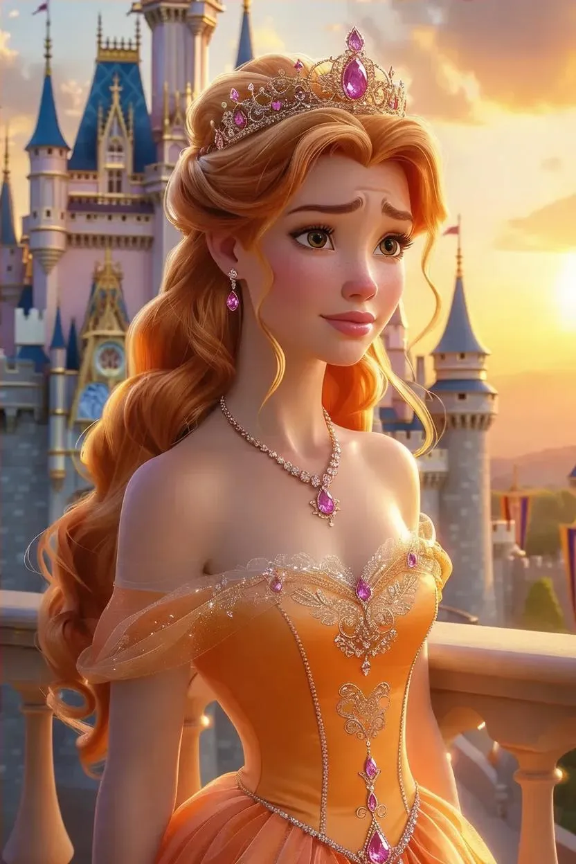 Create an AI-generated Disney princess with vibrant orange hair, a sparkling pink diamond crown, and a melancholic gaze. VivaGo.ai crafts enchanting, emotional characters in magical castle settings. Perfect for storytelling, fantasy art, or Disney-inspired creations using advanced AI image generation technology.