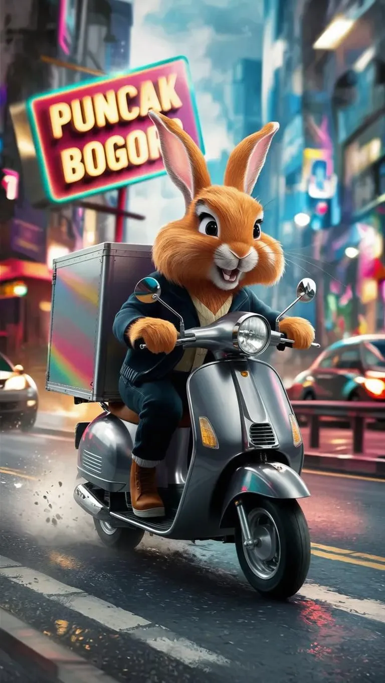 Create an AI-generated scene of a gangster rabbit speeding on a neon-lit scooter through vibrant 3D streets, with dynamic front lighting and a "Puncak Bogor" backdrop. Explore bold frown expressions, high-energy action, and retro neoncity vibes in this humorous, AI-powered visual narrative. Perfect for eye-catching digital content with professional editing tools.