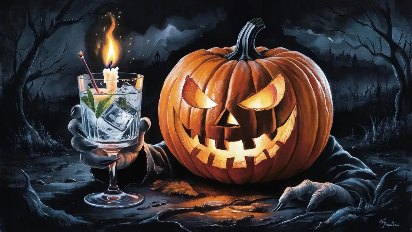 Create a spooky AI-generated ink painting of a drunk jack o' lantern with gin and tonic using Vivago.ai. Transform text prompts into eerie Halloween art with professional ink effects and editing tools for captivating, creative results.