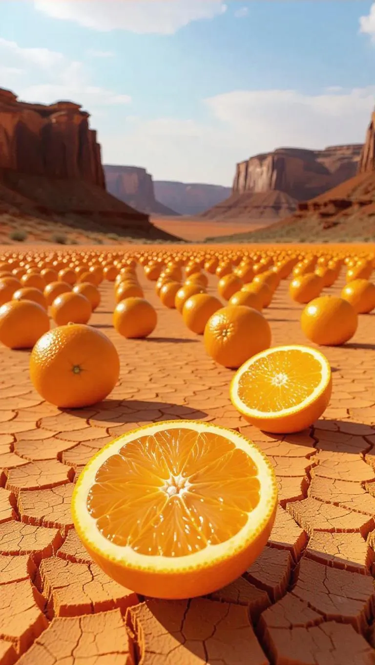A vast, cracked desert where the land curls like dried orange peel, giant citrus winds whirl across the plains, leaving trails of zest and golden dust. Canyons run with frozen orange juice, nomads ride kiwi beetles across grapefruit dunes that pulse like breathing lungs.