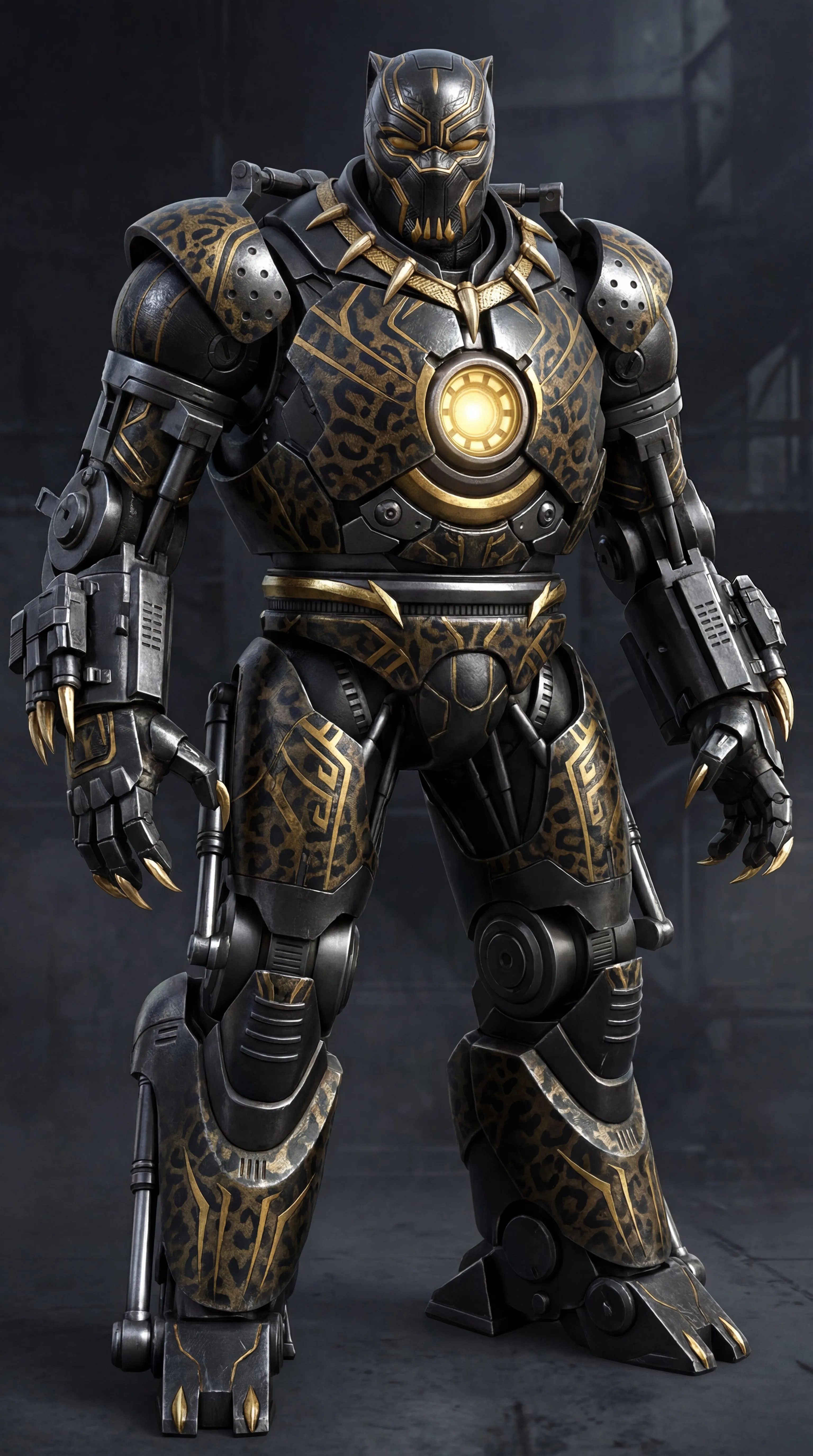 Create the ultimate Marvel fusion: Iron Killmonger suit. AI merges Killmonger's Panther Habit with Obadiah Stane's Iron Monger armor into one powerful design. Generate this unique Erik Stane/Obadiah Stephens hybrid armor concept with vivago.ai's advanced image generation tools. Perfect for fans of cinematic AI art and superhero mashups.