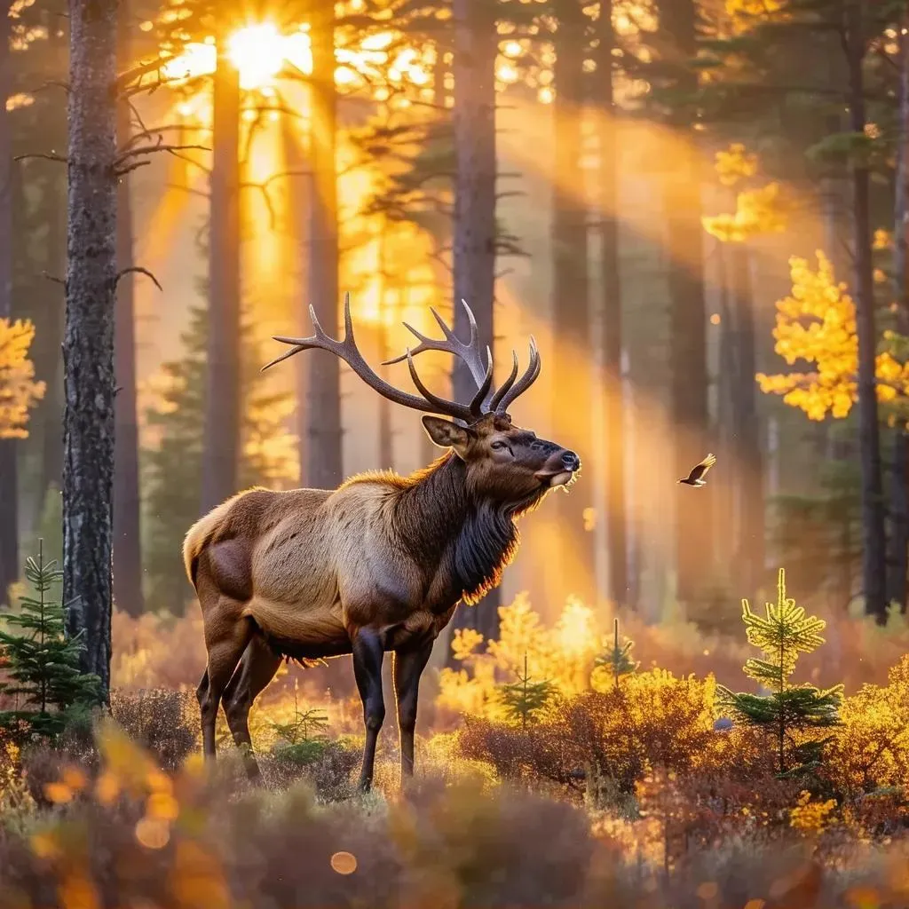 Craft stunning AI-generated wildlife photography with a majestic elk silhouette at dawn. Misty forest landscapes, golden sunbeams, autumn hues, and ethereal light blend for cinematic visuals. Enhance with dramatic lighting, atmospheric fog, and solitary bird flight. Perfect for mystical ambiance, high contrast, and serene nature scenes. Transform text prompts into professional-grade imagery using VivaGO's AI-powered creative tools.