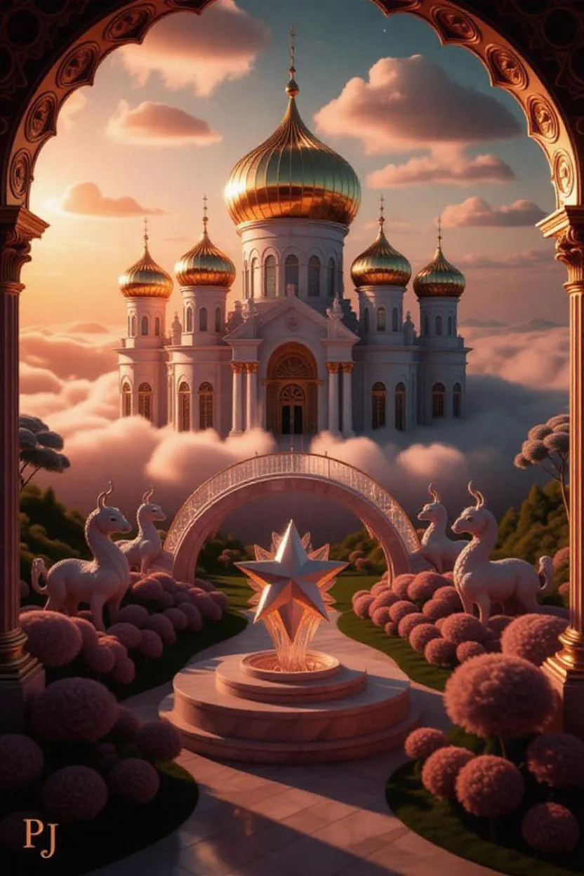 Discover AI-crafted celestial palace art blending ethereal architecture with cosmic fantasy. Featuring gold-veined marble towers, constellation-etched domes, and prismatic stained glass casting rainbow fractals. Levitating gryphons guard a star-crowned spire above a luminous cloud sea. Polyart textures reveal mother-of-pearl sunrise captures and celestial quartz maps. Portrait composition amplifies vertical majesty with mirror-still sky-ocean reflections.