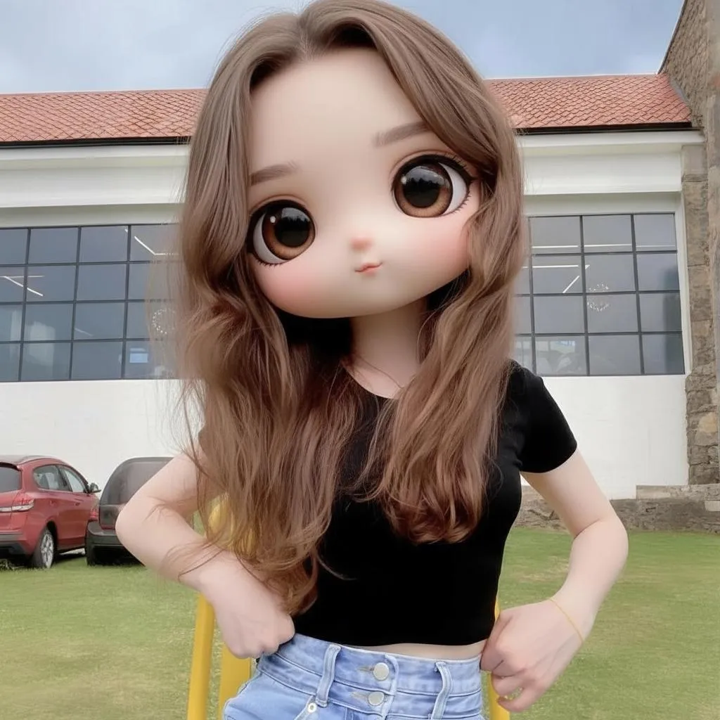 Convert the face of the person in the photo to a chibi-style or cute anime doll face, mimicking the exaggerated, rounded features seen on the right. Increase the head size to a larger, more prominent proportion relative to the body, making sure the neck and shoulders blend smoothly and naturally. Specifically, enlarge the eyes significantly, reduce the size of the nose and mouth, and give the head a more spherical, child-like appearance. Keep the original body, hairstyle, and outfit intact.