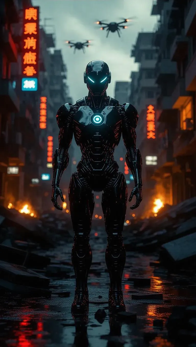 Generate a cinematic post-apocalyptic scene with a futuristic humanoid robot amid a destroyed cityscape. AI transforms text prompts into dystopian visuals featuring metallic robots, crumbling buildings, glowing lights, drones, and dramatic sci-fi atmosphere. Create professional-grade AI images/videos with vivid details like burning debris, neon signs, and advanced tech remnants.