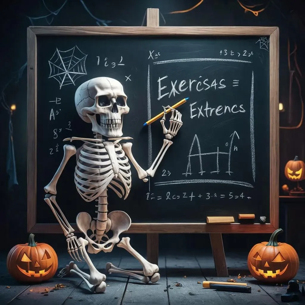Generate a realistic AI image of a cheerful skeleton writing Exercise Science notes on a chalkboard, blending Halloween spookiness with educational themes. Features Rule of Thirds composition, vibrant autumn colors, and playful eerie elements for engaging social media content. Perfect for fitness professionals seeking festive yet professional visuals.