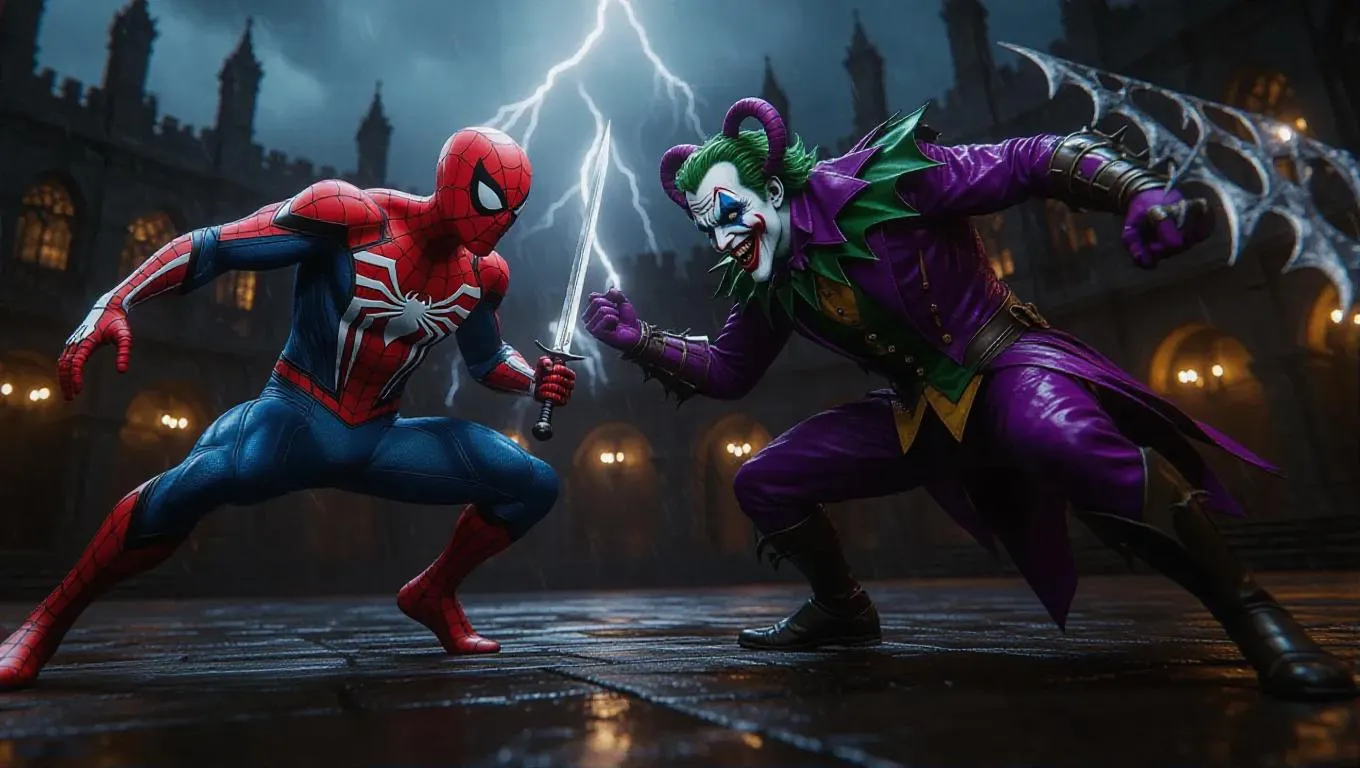 In a dark medieval arena under a stormy sky, a knight in red and blue Spider-Man-inspired armor faces off against a twisted Joker-like knight in chaotic, purple-and-green battle armor. The Spider-Knight’s armor features intricate web patterns, glowing red eyes, and flexible joints. He crouches, one gauntleted hand on the ground, ready to pounce. The Joker-Knight spins a jagged, oversized sword with laughing-face engravings, his helmet a twisted jester mask. Lightning flashes, casting eerie shadows. The ground is cracked, wet with rain, weapons scattered. Dynamic battle-ready poses, cinematic lighting, 16:9 ratio, ultra-detailed dark fantasy style.