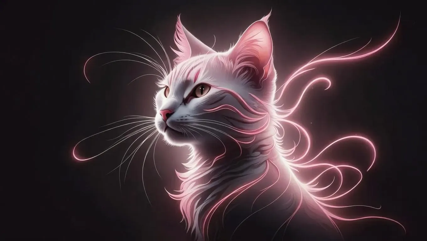 Create striking AI-generated line art of a cat with vivid pink outlines on black. Minimalist flat design highlights ethereal grace and fine fur details. High-contrast lighting and focus stacking enhance depth for a sleek, iconic aesthetic. Perfect AI-generated animal imagery blending mystery, elegance, and modern photographic minimalism in line art styles.