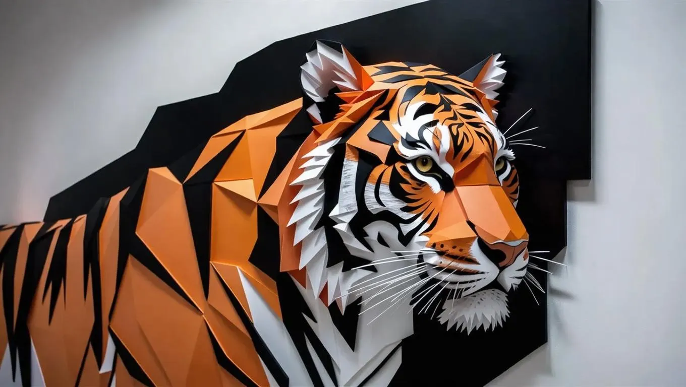 Create bold geometric tiger wall art in striking black and orange using AI. Modern two-tone designs merge minimalist shapes with wild energy for eye-catching decor. Perfect for contemporary spaces, generate AI-powered animal-themed artwork to elevate home or office interiors with dynamic, stylized visuals.