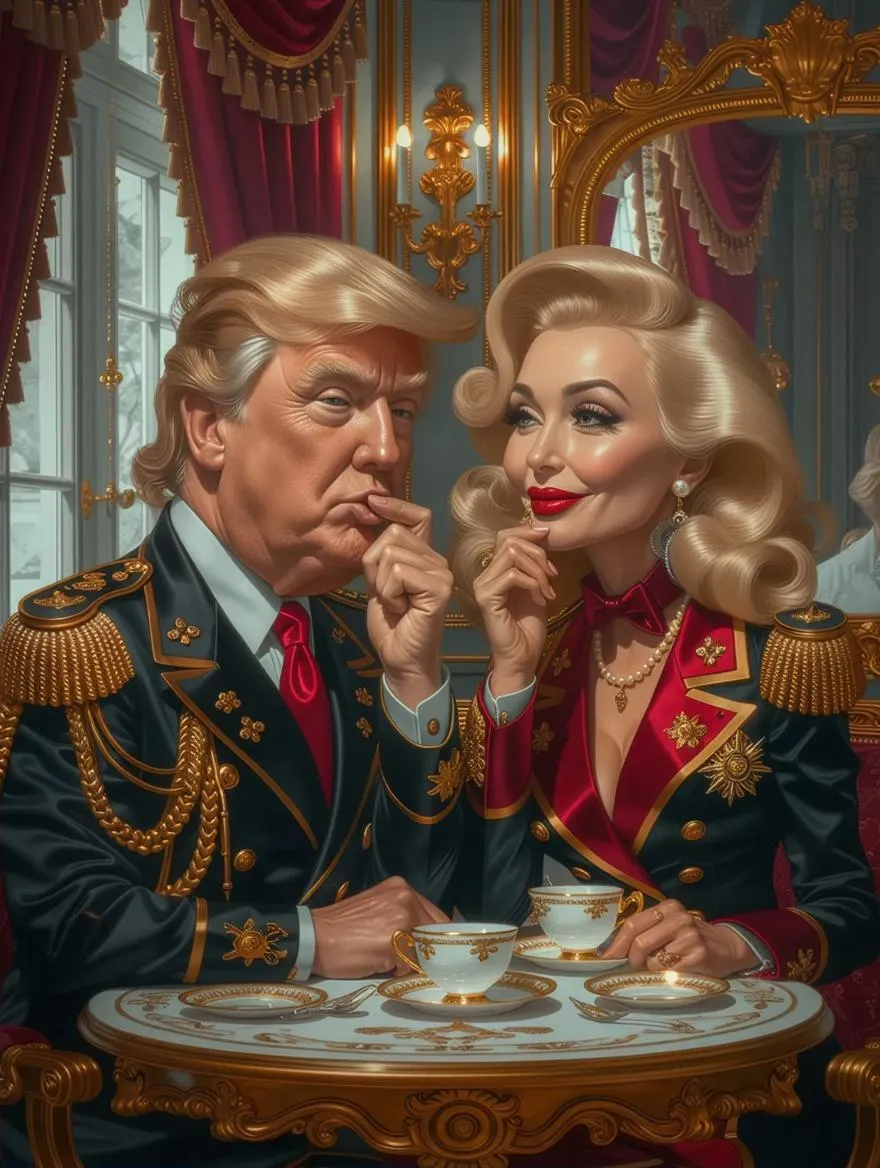 Generate a satirical AI illustration of female Trump & Putin in rococo-inspired café attire, blending political caricature with fashion editorial aesthetics. Vivago.ai crafts high-detail painterly scenes exploring power dynamics through lavish uniforms, ornate decor, and theatrical lighting—transforming text prompts into whimsical-yet-incisive commentary on global vanity using advanced AI image generation tools.