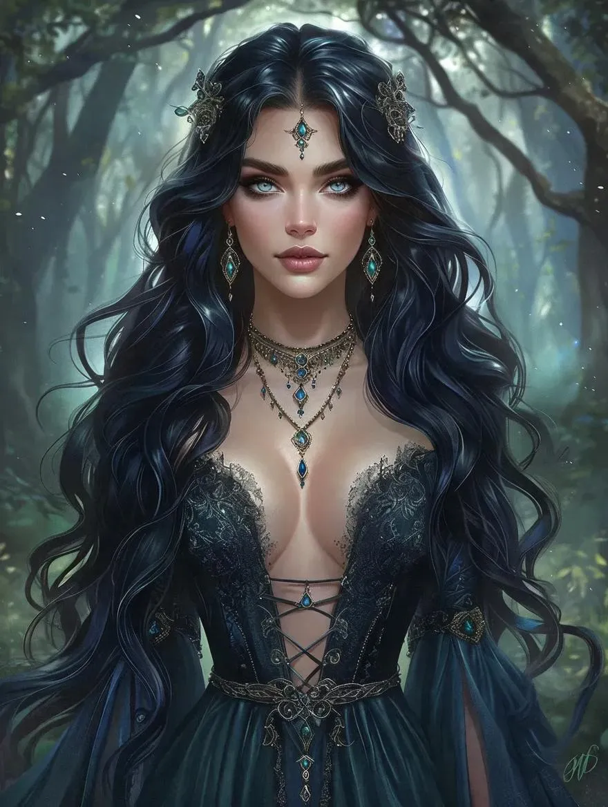 Create an enchanting fantasy witch with dark red hair, deep blue eyes, and a sultry low-cut dress using Vivago.ai. Enhance with mystical rings, necklaces, and AI effects for spellbinding full-body artistry. Ideal for mesmerizing storytelling, mystical visuals, and professional-grade fantasy character design.