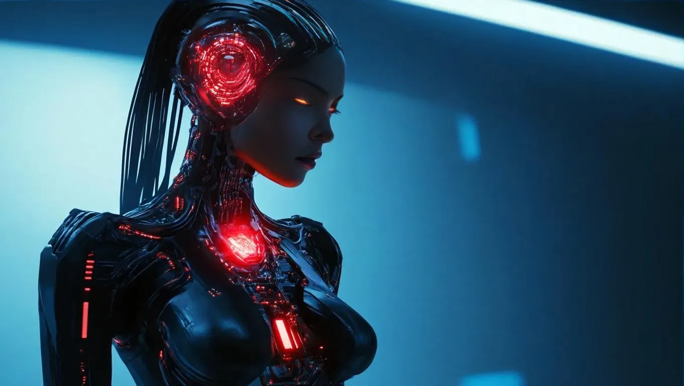 Generate a striking AI cybernetic woman with glowing neon circuits and intricate mechanical details using VivaGo AI. Transform text prompts into 32K sci-fi movie stills, featuring advanced AI core visuals and deep black exoskeletons for professional-grade futuristic art.