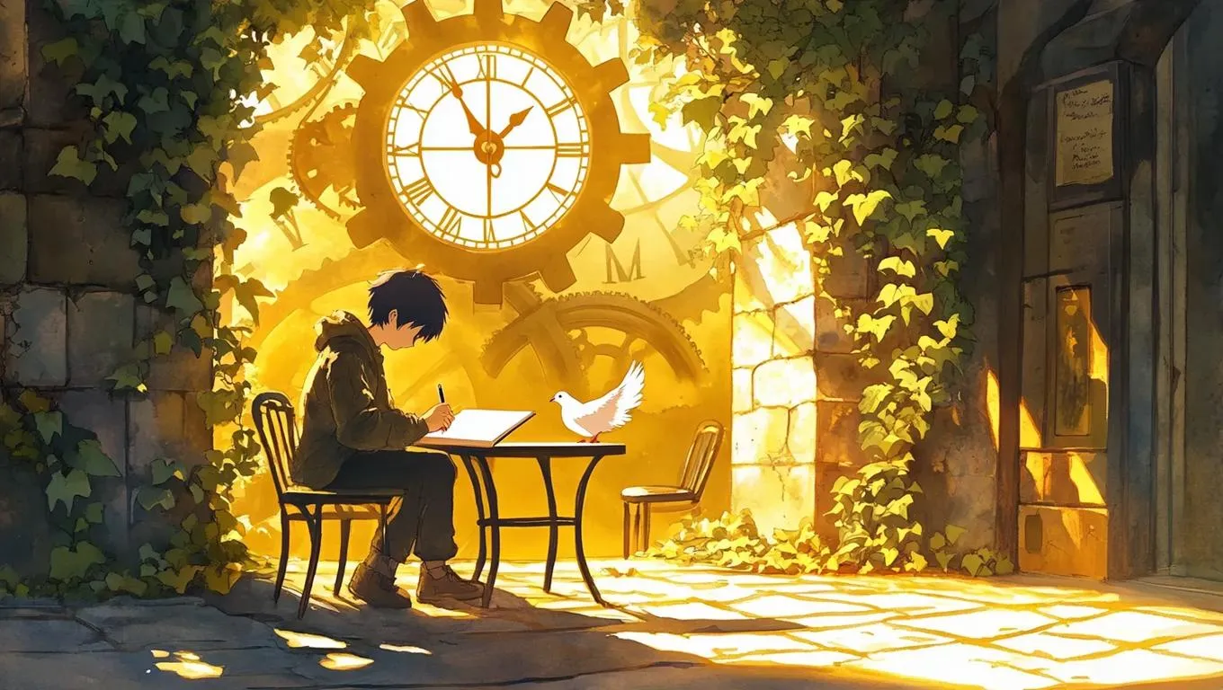 Create serene anime scenes with AI-generated art featuring a boy sketching under a golden clocktower. Cinematic details like ivy-covered gears, a white pigeon, and soft Ghibli-style composition blend warm watercolor tones and golden ink. Transform text prompts into dreamy, cinematic visuals with precision—ideal for anime-inspired storytelling and AI-powered creative projects.