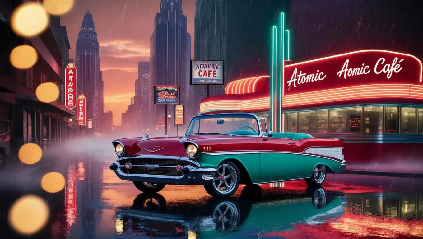 AI-generated retro-futuristic imagery reimagines a 1957 Chevrolet Bel Air cruising a neon-drenched metropolis. Art Deco skyscrapers, rain-slicked streets, and glowing "Atomic Café" signs frame this cinematic scene. Chrome accents, teal tailfins, and candy-apple-red finish pop against vintage billboards, lens flares, and bokeh rain. Mid-century Americana meets cyberpunk vibrancy in this AI-crafted blend of 1950s elegance and futuristic urban energy.