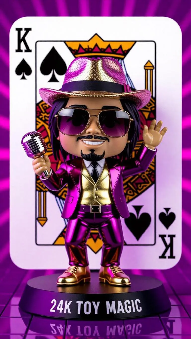 ???? K♠ – Bruno Mars: Funky Mini Mode Framed in a funky electric-themed King of Spades card. Frame: A toy-figure version of Bruno Mars in chibi-vinyl style. He wears a metallic red blazer, golden fedora, oversized sunglasses, and holds a toy mic shaped like a disco ball. His plastic body has shiny molded textures, with his legs frozen mid-spin like an action-figure on a rotating base. His expression: playful smirk, eyebrows raised like he’s about to drop a verse. He stands on a platform that says “24K TOY MAGIC”. Card Frame: Neon chrome outline with black-gold accents. Corners show spade icons made of mini speakers and spark-plugs. Background glows with a disco-themed pattern: colored tiles, glitter sparks, sound-wave lines. Nameplate at bottom reads: “Bruno Mars – Funky Mini Mode” Styled in pixel-art gold foil font with lightning bolts. Aura: Retro-toy groove meets vinyl swag — think 80s toy ad meets dance-battle in a music box.