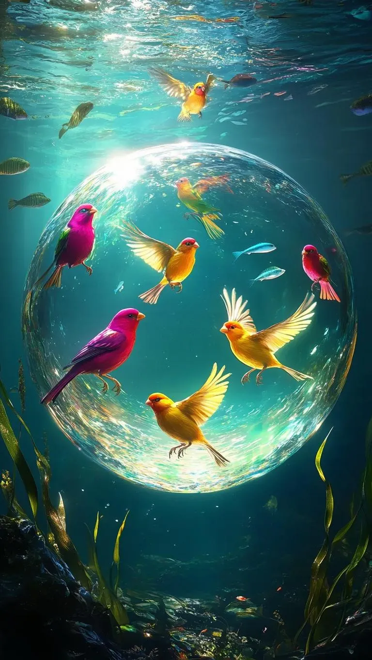 Explore a hyperrealistic underwater world with a glowing crystal ball encasing vibrant canaries. AI-generated effects bring surreal luminosity and vivid details to this submerged scene. Perfect for creative projects seeking professional-grade, luminous visuals. Transform your ideas into stunning realities with vivago.ai's advanced AI tools.