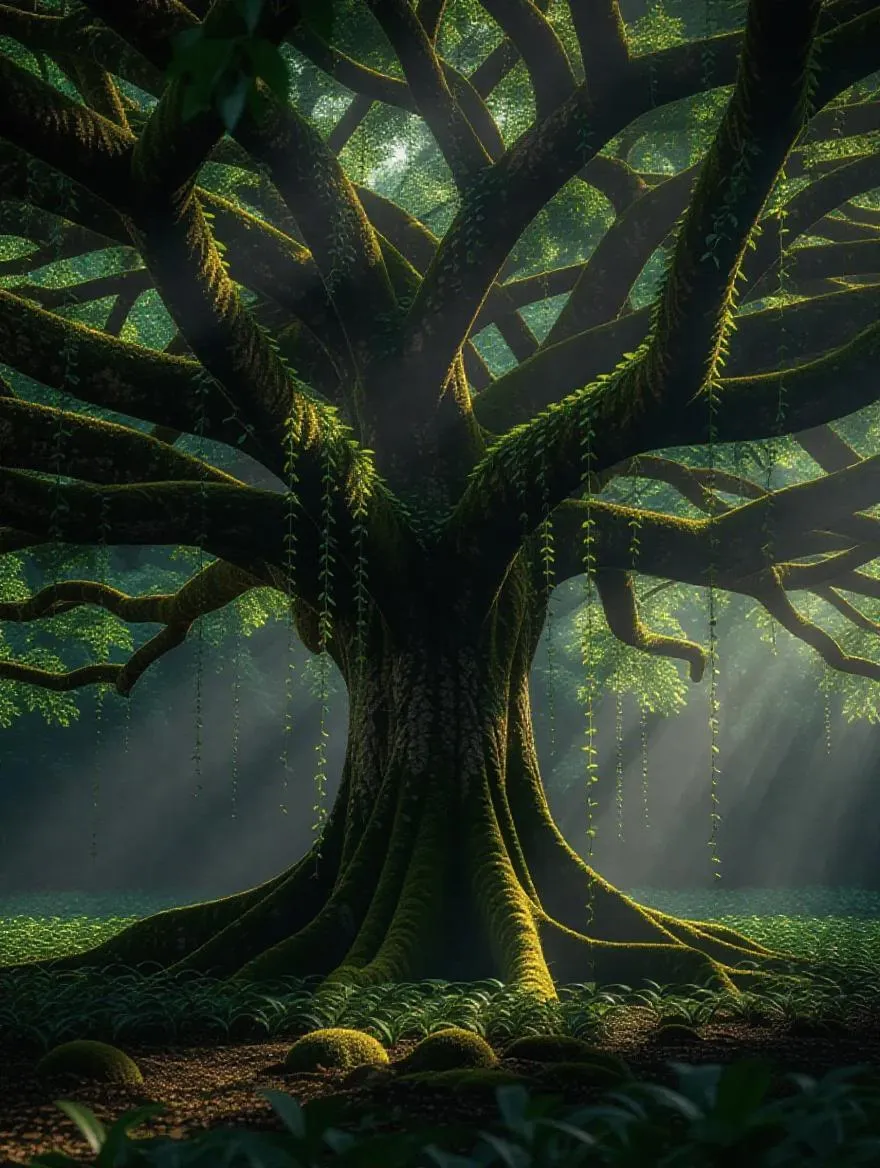 Transform your prompt into stunning AI visuals with vividago.ai. Generate a lush forest scene featuring a majestic tree draped elegantly with hanging vines. Create captivating nature images effortlessly using advanced AI art generation tools for professional results.