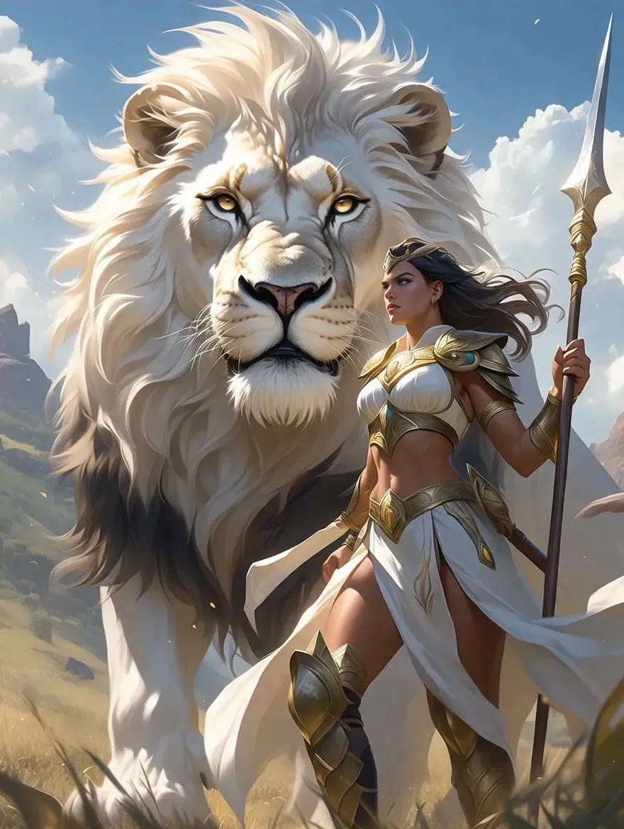 Create stunning AI-generated art of a fierce female warrior triumphantly holding an enormous white lion's head on her spear. Detailed facial features, dramatic eyes, and dynamic lighting evoke Peter Mohrbacher's surreal fantasy style. Transform text prompts into vivid visuals with VivaGo.ai's advanced AI image generator.
