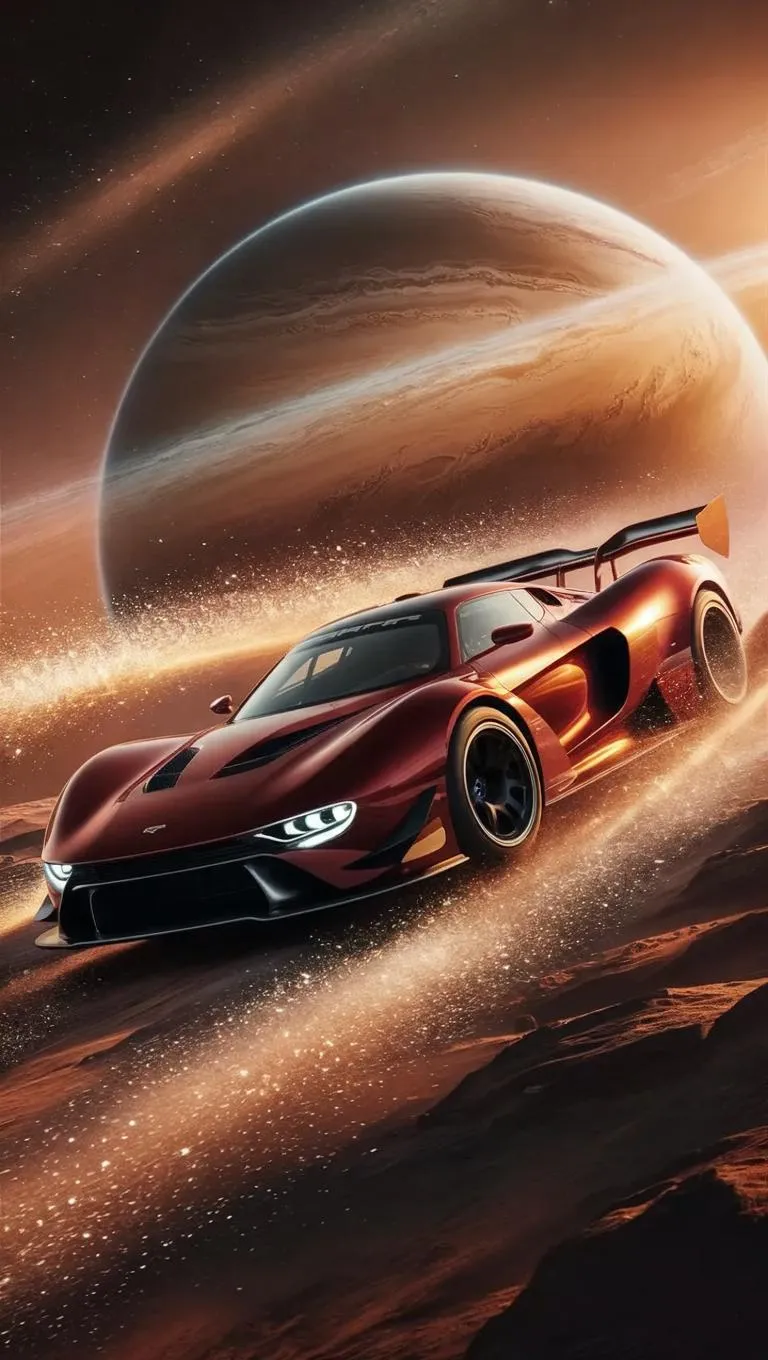 Explore AI-generated surreal art of a racing car transitioning from red-brown to transparent gold in space, with Mars illuminating the backdrop in warm, radiant hues. Experience vivid, sharp 8k visuals for professional-grade creative projects using cutting-edge AI tools.