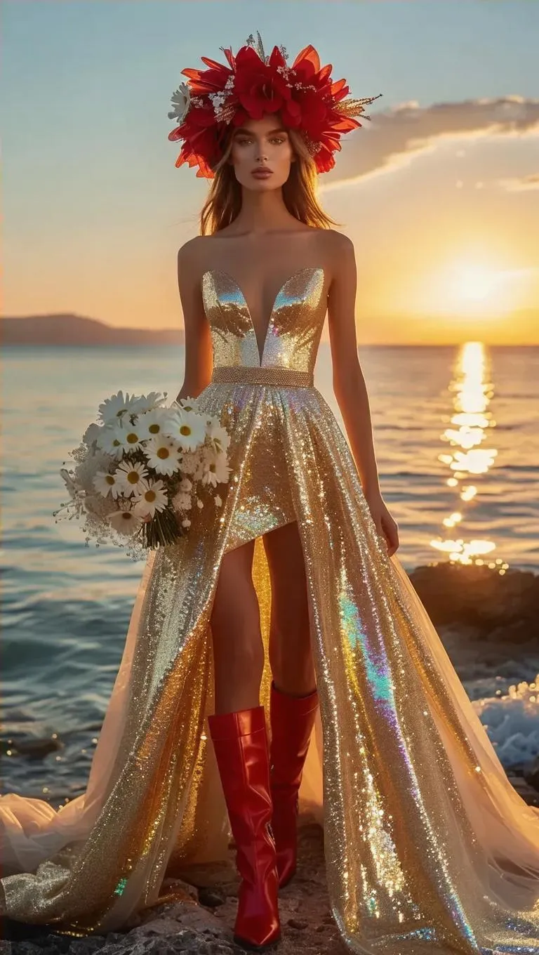 Surreal AI-generated image of a futuristic bride in an iridescent gold knee-length wedding dress, red boots, and chiffon-adorned wreath. Holding a white daisy bouquet, she stands seaside under warm sunlight, radiating elegance. Ultra-sharp 8k resolution highlights intricate details for professional-grade visual storytelling.