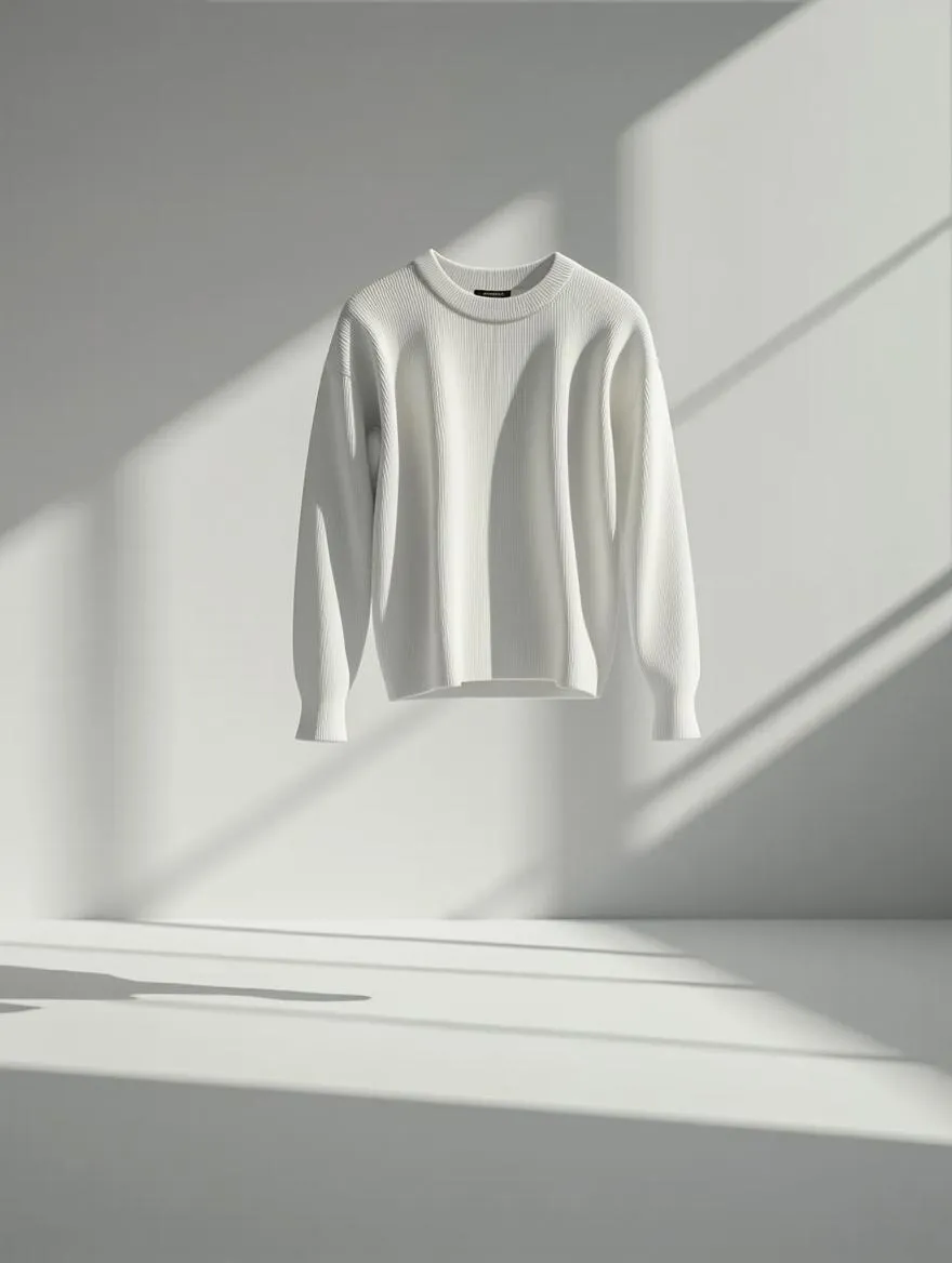 A pristine white sweater floats horizontally in mid-air, slowly descending from ceiling to floor in a weightless, surreal motion, untouched by gravity. No human presence—only the garment suspended in stillness. Soft, diffused lighting casts subtle shadows, emphasizing the fabric’s delicate folds and texture. The background is a smooth, matte gray, enhancing the minimalist composition. The overall mood is serene, elegant, and otherworldly, with a refined balance between silence and motion. High-resolution detail captures every fiber and curve, evoking quiet sophistication and a sense of poetic suspension.