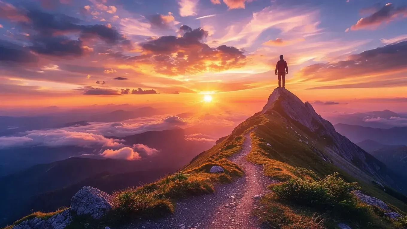 Overcome fear with AI-generated visuals of serene mountain peaks at sunrise, embodying inner strength and courage. Warm orange, pink, and purple hues blend with gentle breezes, radiating calm and empowerment. Nature’s tranquil path leads to a hopeful horizon—create confident, inspiring affirmation art with VivaGo.ai.