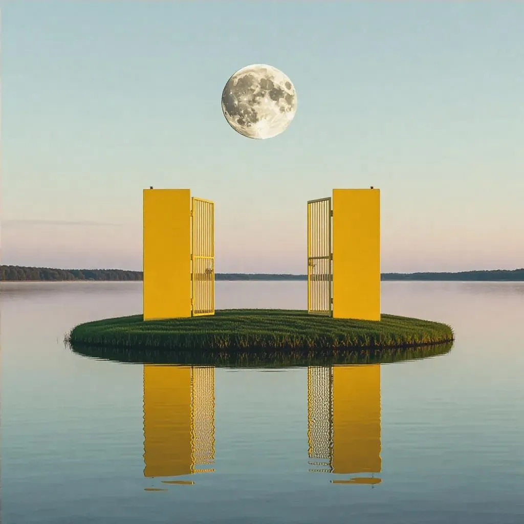AI-generated image of serene yellow industrial gates on a grassy island, mirrored in still water under a gray-yellow moon. Muted tones, artistic symmetry, and smooth reflections evoke tranquility. Perfect for commercial, civil, or creative projects seeking peaceful, harmonious visuals with stark contrasts and professional-grade AI effects. Ideal for ads, websites, or artistic portfolios.