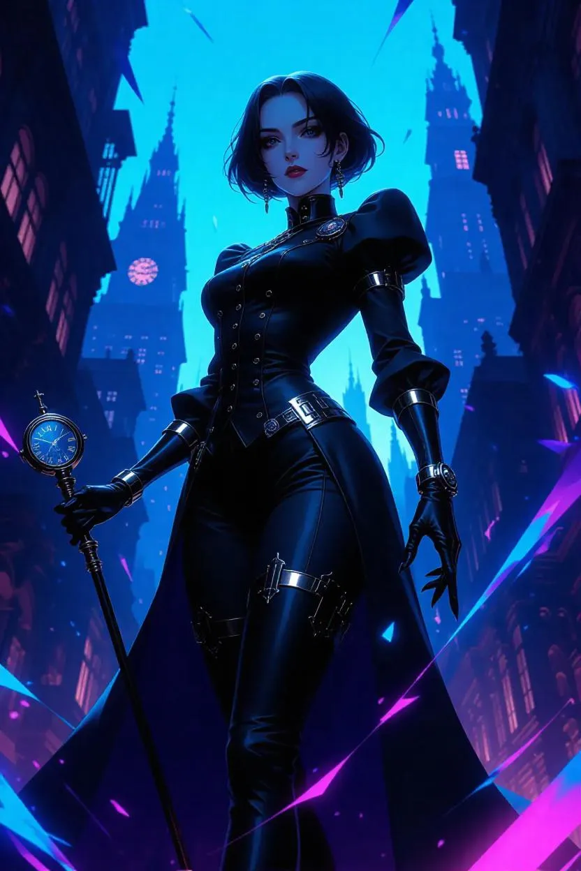 Generate Dr. Chronos AI art: a time-bending villainess with a clockwork heart in a fractured cityscape. Wearing Victorian-futuristic tech, she manipulates temporal streams amidst warped eras. Blending Alphonse Mucha's Art Nouveau elegance with Greg Rutkowski's dark fantasy. Create stunning 8K resolution AI art with intricate detail and ethereal light. Vivago.ai brings this vision to life.