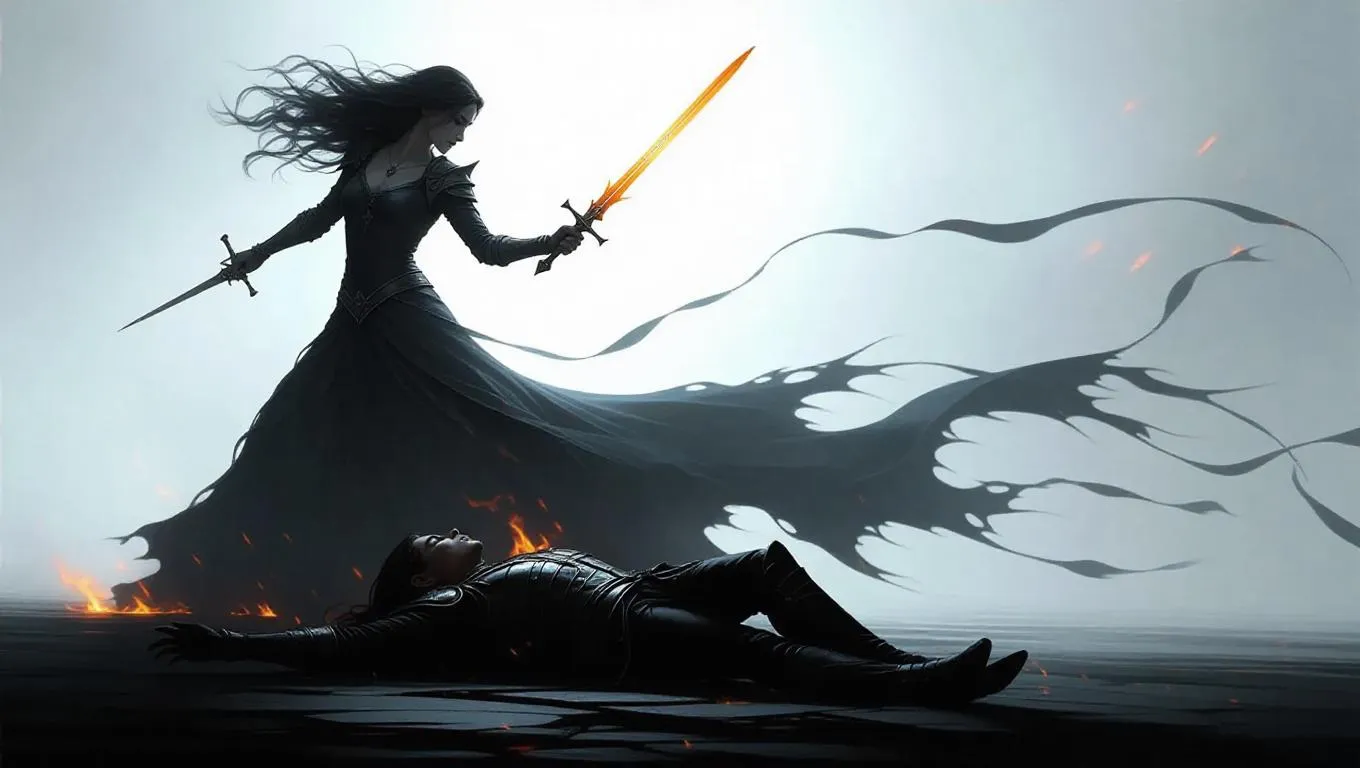 Craft mesmerizing AI-generated visuals of a Shadow Dancer with a blazing blade, dancing atop a fallen warrior in haunting darkness. Explore vivago.ai's AI art tools to bring ethereal dark fantasy scenes, dynamic character designs, and dramatic narrative visuals to life through text-to-image magic and professional editing effects.