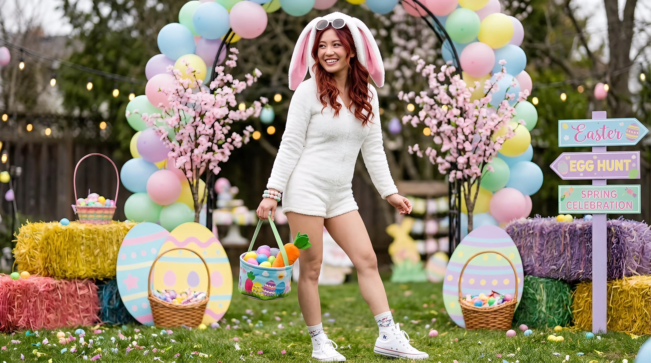 Full-body image of a hot, very beautiful, very slim red-haired Japanese woman with voluptuous breasts in a skimpy, provocative, skin-tight Easter bunny macrokinis consisting only of very thin strips of white fur with a provocative, very low neckline, bright colors, playful bunny ears, sparkling eyes, and a mischievous smile in front of a colorful, festive, lascivious Easter background with no other people.