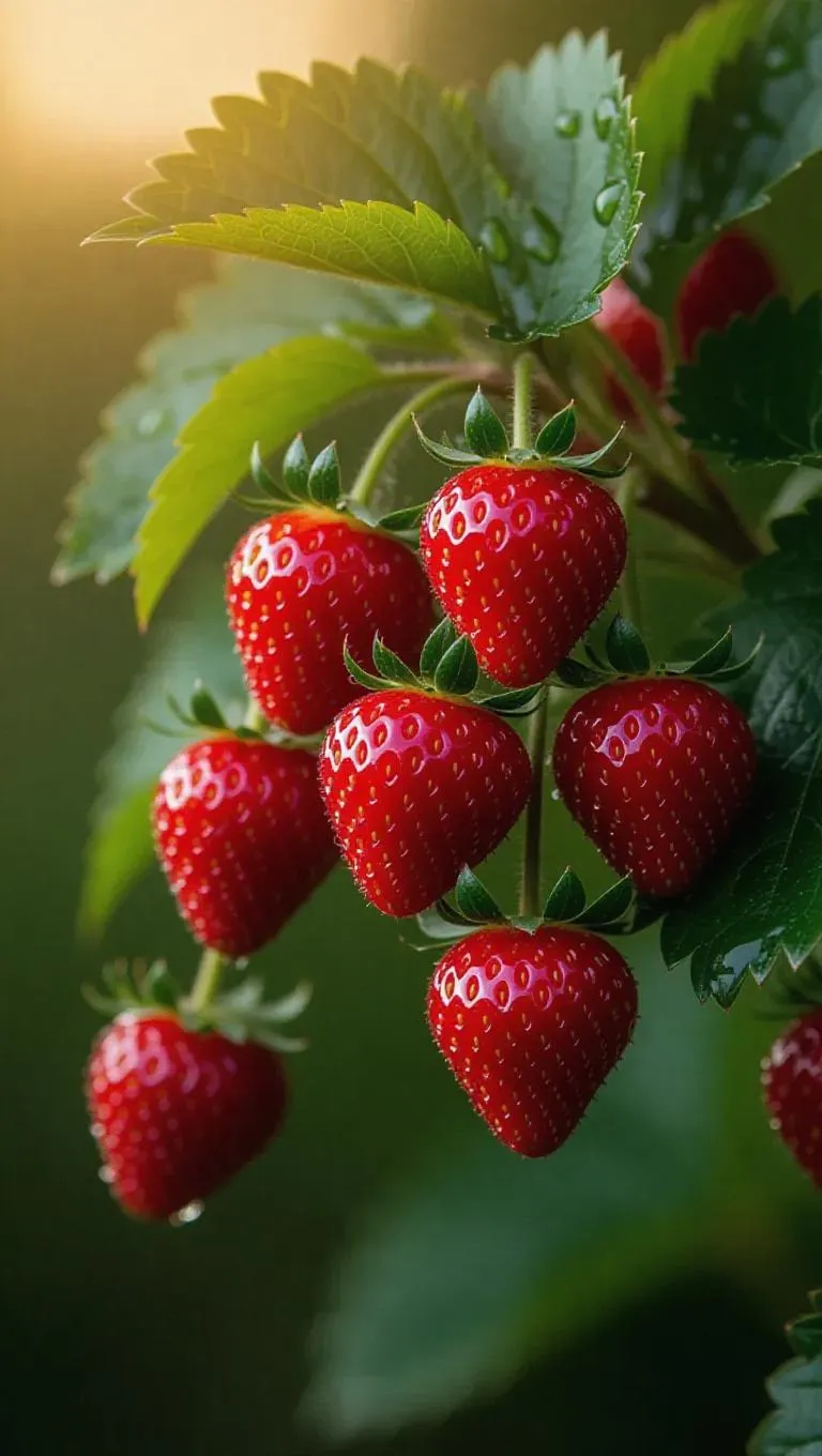 Generate lifelike AI images of vibrant red strawberries with glistening water droplets on branches, nestled among lush green leaves. Perfect for food photography, ads, or nature-themed visuals. Elevate your content with vivago.ai's realistic AI image tools and soft-focus backgrounds.