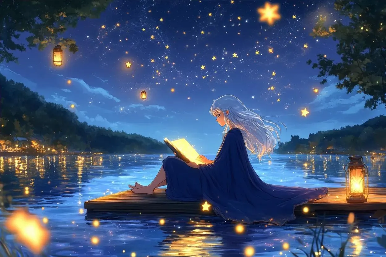 Craft enchanting AI-generated anime art with Vivago.ai. Visualize a starlit lakeside dusk featuring a celestial traveler, glowing constellations, and Ghibli-inspired watercolor scenery. Generate serene summer nights, luminous fireflies, and nostalgic fantasy atmospheres effortlessly. Perfect for cinematic, dreamy visuals with celestial accents. Transform your vision into mesmerizing anime-style artwork.