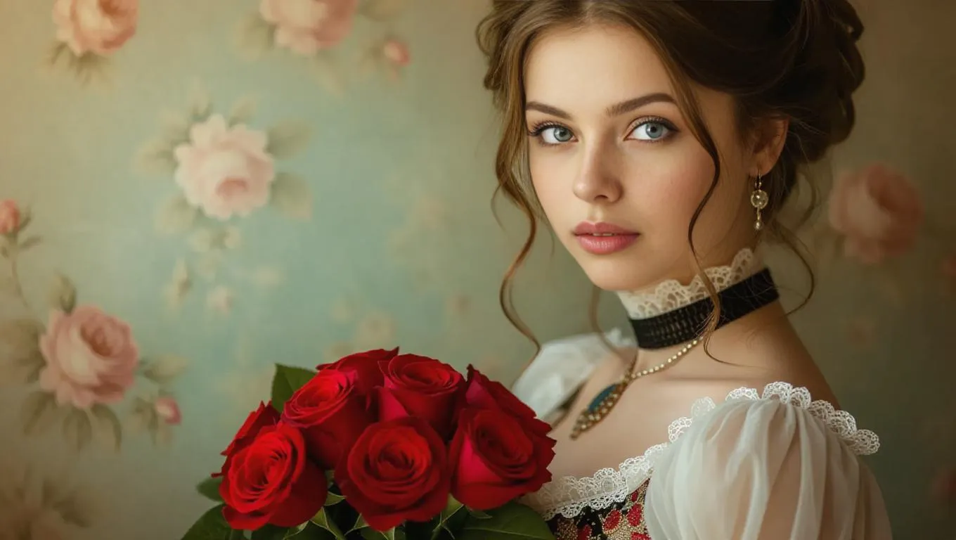 Victorian-era portrait of an elegant young woman holding vibrant red roses, crafted with AI. Transform text prompts into timeless beauty using VivaGo.ai's professional-grade AI tools for lifelike historical imagery and artistic photo effects.