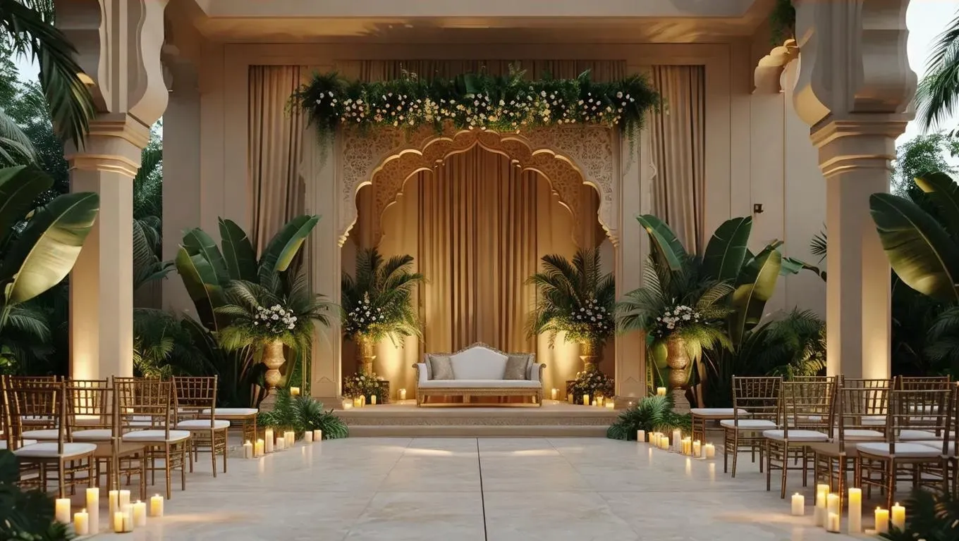 Create stunning AI-generated Indian wedding decor with tropical summer vibes. Minimalistic mandap design featuring gilded leaves, candlelight, and modern elegance. Includes couple's seating, guest chairs, ornate stage, and grand hall arrangements. Perfect blend of traditional charm and contemporary style for visual inspiration. Explore AI-powered wedding themes for professional, culturally rich imagery.